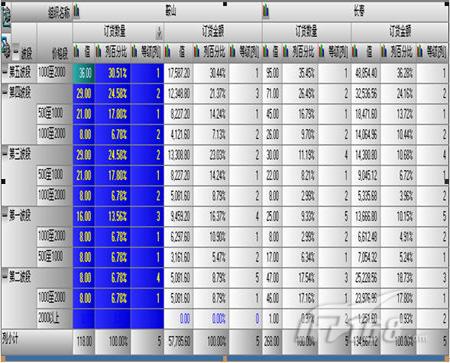 這個訂單的分析模型可以參照前面的銷售數(shù)據(jù)分析模型,大概可以分為:產(chǎn)品品類分析、產(chǎn)品款式分析、產(chǎn)品色系分析、產(chǎn)品配碼比例分析(如果是按配比訂貨而不用這個分析模型)、產(chǎn)品上市波段比例分析、訂貨/銷售數(shù)據(jù)對比分析、產(chǎn)品訂貨價格段分析、門店上貨計劃分析等。關(guān)于分析的報表樣式可以參照如下: