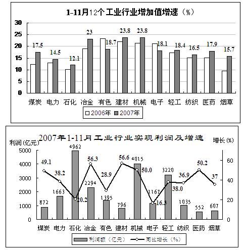 1-11月,主要工業(yè)行業(yè)生產(chǎn)繼續(xù)較快增長,效益增幅均保持兩位數(shù)以上水平。其中,建材、冶金、醫(yī)藥、機械行業(yè)利潤增幅超過50%,煤炭、電力、輕工、煙草、紡織行業(yè)利潤增長36.9%-49.1%,有色、石化、電子行業(yè)利潤增長16.3%-28.9%。當月,冶金、有色、建材、輕工、紡織、機械、電子、醫(yī)藥行業(yè)生產(chǎn)增速較上月有所回落,煤炭、石化、電力行業(yè)生產(chǎn)增速比上月加快。