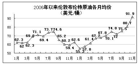 11月份,全國原油產(chǎn)量同比增長1%。原油加工量增長3.8%;其中汽油產(chǎn)量增長4.7%,增速與上月持平,柴油產(chǎn)量增長6.1%,比上月加快1.4個百分點。天然氣產(chǎn)量增長16.4%,減緩7.9個百分點。國際原油價格大幅上漲,當月布倫特原油平均價為91.9美元/桶,比上月上漲11.1美元/桶,同比上漲32.5美元/桶,漲幅分別為13.8%和54.6%。國家于11月1日上調(diào)成品油價格,并采取加強調(diào)節(jié)、增加資源投放等多項措施,經(jīng)過各方努力,成品油供應(yīng)緊張狀況總體有所好轉(zhuǎn)。