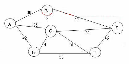 2.有一批貨物要從A地運(yùn)往B、C、D、E、F各地,它們之間的距離如下圖,圖中直線上的數(shù)據(jù)表示相應(yīng)的行車距離(單位:公里)。請采用單一路徑方法求出A地到其它各地的最短運(yùn)輸路線及其相應(yīng)的公里數(shù)。