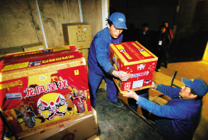 今天零時(shí),滿載煙花爆竹的貼有“熊貓煙花”標(biāo)識的危險(xiǎn)貨物運(yùn)輸專用車輛及統(tǒng)一著裝的熊貓煙花工作人員從北京市熊貓煙花有限公司位于房山區(qū)韓村河鎮(zhèn)的倉庫發(fā)車,正式開始了北京市五環(huán)路內(nèi)煙花爆竹零售網(wǎng)點(diǎn)的配送,標(biāo)志著2008年北京市五環(huán)路內(nèi)的煙花爆竹銷售工作進(jìn)入最后準(zhǔn)備階段。