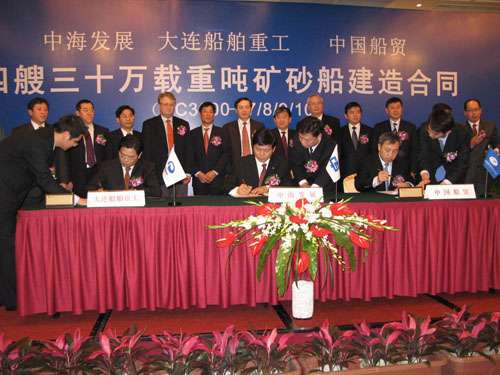 中海發展、大連船舶重工、中國船貿上周在廣州白天鵝賓館舉行4艘30萬噸級超大型礦砂船(VLOC)建造合同簽字儀式。
