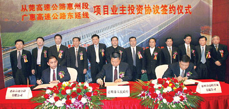 今年是市委、市政府確定的交通建設(shè)年。新年伊始,喜訊傳來:我市東西兩翼將上馬建設(shè)兩條高速公路。昨日下午,從(從化)莞(東莞)高速公路惠州段及廣惠高速公路東延線項(xiàng)目業(yè)主投資協(xié)議書簽約儀式在市區(qū)康帝國(guó)際酒店舉行。市領(lǐng)導(dǎo)黃業(yè)斌、李汝求、黃仕芳、吳衛(wèi)華、楊有義、林添好、謝仕強(qiáng),市直有關(guān)部門和博羅縣、惠東縣有關(guān)負(fù)責(zé)人及項(xiàng)目業(yè)主代表參加簽約儀式。