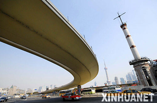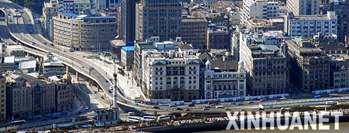 俯瞰即將被拆除的上海延安路高架外灘下匝道(2008年2月10日攝)。