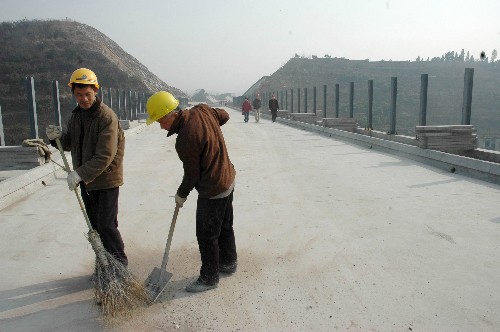 2月27日,工人在宜萬鐵路宜昌長江大橋上清掃,為鋪軌作準(zhǔn)備。
