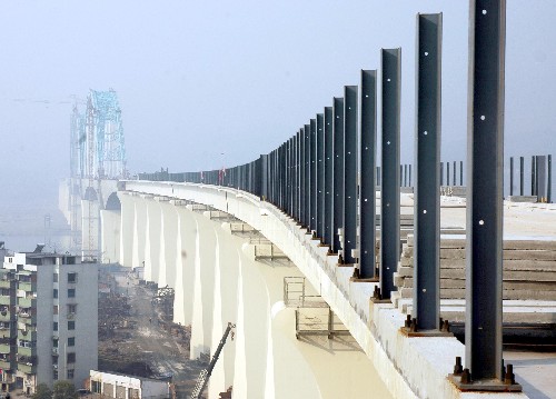 2月27日拍攝的宜萬鐵路宜昌長江大橋。 近日,宜(昌)萬(州)鐵路控制性工程--宜昌長江大橋的橋面施工全部結(jié)束,引橋護欄施工接近尾聲,大橋已具備鋪軌條件。