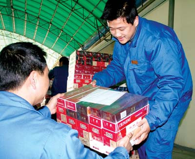 送貨員正往車(chē)上搬運(yùn)分揀好的卷煙。