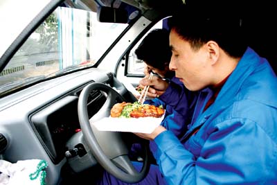 為了及時(shí)將卷煙送到零售客戶手中,送貨員經(jīng)常加班加點(diǎn)工作,午飯一般都在車(chē)上吃。