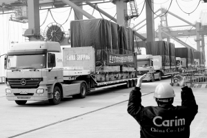 昨日,寸灘集裝箱港,裝載精密儀器的奔馳防震車隊(duì)啟程到四川 記者 鐘志兵 攝