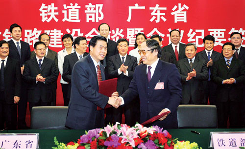 3月7日,全國“兩會”期間,北京復興路的鐵道部會議室里,廣東省與鐵道部共同簽下了《關(guān)于進一步加快廣東鐵路建設(shè)有關(guān)問題的會議紀要》。同一天,同一個會議室,廣東省又與鐵道部、交通部、海南省就加快推進瓊州海峽跨海通道工程建設(shè)前期工作有關(guān)問題舉行了會談,并簽署《關(guān)于瓊州海峽跨海通道建設(shè)的會議紀要》。