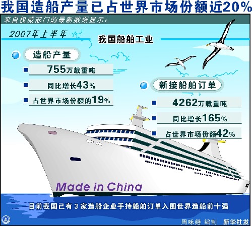 圖表:2007年上半年,我國造船產量已占世界市場份額近20% 新華社發