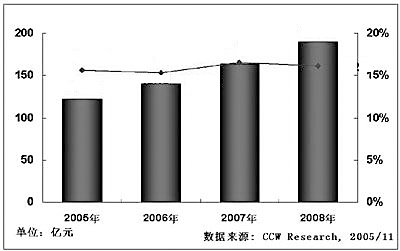 近幾年,我國(guó)交通物流領(lǐng)域?qū)π畔⒒男枨笕找嬖鲩L(zhǎng),IT投資年年攀升。據(jù)統(tǒng)計(jì),在交通領(lǐng)域,2003年到2005年這三年的IT投資總額分別為83億元、105.26億元、121.74億元,增長(zhǎng)率分別為18.6%、26.8%、15.6%。計(jì)世資訊研究中心研究結(jié)果預(yù)計(jì),未來三年我國(guó)交通行業(yè)IT投資額年均增長(zhǎng)率將在15%以上,到2008年IT投資額將超過190億元,(見圖一)。在物流運(yùn)輸領(lǐng)域,中國(guó)物流信息中心資料顯示,2004年~2006年我國(guó)物流行業(yè)信息化每年的總體市場(chǎng)規(guī)模將在20~35億元人民幣之間,年增長(zhǎng)率在15%以上?梢,交通物流領(lǐng)域的信息化的確是座金礦,是一項(xiàng)“效益工程”。