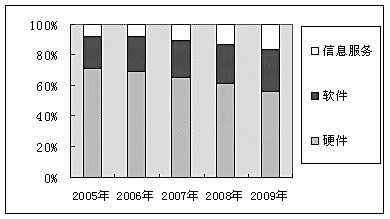在物流信息化建設(shè)方面,當(dāng)前中國(guó)物流市場(chǎng)規(guī)模以年均30%的比例遞增,物流信息系統(tǒng)的市場(chǎng)需求加速擴(kuò)大,第三方物流企業(yè)中獨(dú)立提供物流信息服務(wù)的企業(yè)會(huì)不斷增多。專家預(yù)測(cè),2006以后,隨著信息化建設(shè)的深入,物流領(lǐng)域硬件投資比例將逐漸減少,軟件和信息服務(wù)投資比例相應(yīng)增加。2005~2009年物流行業(yè)的IT應(yīng)用投資結(jié)構(gòu)中,硬件投資所占比例將從70%左右逐步降低至50%左右,信息服務(wù)所占的比例將會(huì)從8.0%上升到16.8%(見圖二)。在內(nèi)容、信息資源的開發(fā)和運(yùn)作上第三方物流公司會(huì)更具有優(yōu)勢(shì),電信運(yùn)營(yíng)商應(yīng)該充分利用自己的用戶資源優(yōu)勢(shì),與其展開合作,通過網(wǎng)絡(luò)通道和終端將信息傳遞給定制的用戶。