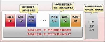 為企業(yè)信息系統(tǒng)建設提供了統(tǒng)一的公用基礎設施平臺,X3協(xié)同業(yè)務平臺采用“主板+插件”的模式來構建和擴展業(yè)務系統(tǒng),各類業(yè)務系統(tǒng)直接構架或連接到統(tǒng)一的協(xié)同業(yè)務平臺上,并以其為基礎和樞紐,將分散的企業(yè)應用管理系統(tǒng)整合起來,形成一個有機的、緊密聯(lián)系的整體。