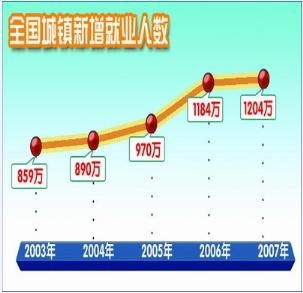 近5年來,黨中央、國務(wù)院將就業(yè)工作擺在經(jīng)濟(jì)社會發(fā)展的突出位置,通過實施擴(kuò)大就業(yè)的發(fā)展戰(zhàn)略和積極的就業(yè)政策,就業(yè)規(guī)模持續(xù)擴(kuò)大,就業(yè)結(jié)構(gòu)逐步改善,保持了就業(yè)形勢的基本穩(wěn)定。2002年至2007年,全國每年實現(xiàn)新增就業(yè)人數(shù)分別為715萬人、859萬人、890萬人、970萬人、1184萬人和1204萬人;總計有2500多萬國有和集體企業(yè)下崗失業(yè)人員實現(xiàn)再就業(yè),其中680多萬人是再就業(yè)的困難群體;城鎮(zhèn)登記失業(yè)率保持在4.0%至4.3%的較低水平。這為創(chuàng)建和諧穩(wěn)定的社會環(huán)境,推動經(jīng)濟(jì)社會持續(xù)穩(wěn)定健康發(fā)展發(fā)揮了重要作用。