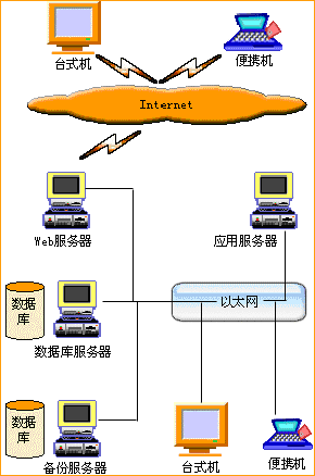 英泰X+i企業(yè)管理軟件可運行在局域網或互聯網環(huán)境中,支持B/S結構。系統(tǒng)的拓撲結構如下圖所示。