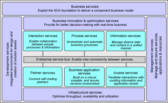 下圖是IBM SOA Foundation對(duì)面向服務(wù)的體系構(gòu)架模型,描述了SOA的重點(diǎn)不在于技術(shù)方面,更重要的是使企業(yè)內(nèi)外部的各種服務(wù)(商務(wù)服務(wù)、交互服務(wù)、流程服務(wù)、開發(fā)和管理服務(wù)等)作為SOA總線的插件協(xié)同工作的原理。