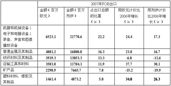 從市場(chǎng)結(jié)構(gòu)看,2007年,用列伊計(jì)價(jià)對(duì)歐盟26個(gè)其他國(guó)家的發(fā)貨額同比增長(zhǎng)了9.3%(折合歐元計(jì)算同比增幅達(dá)16.0%),占到同期出口總額的71.9%。