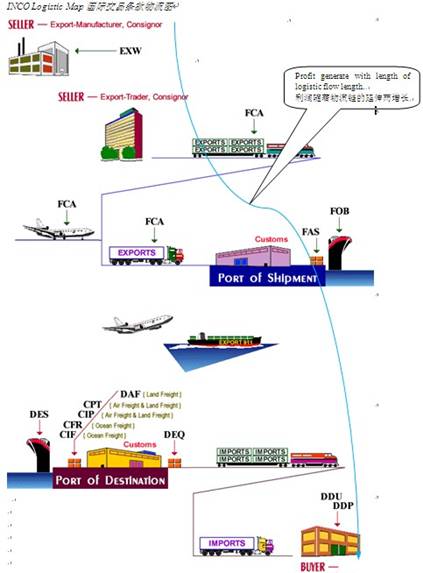 現(xiàn)實(shí)中,貨運(yùn)代理是服務(wù)國(guó)際貿(mào)易的其中一個(gè)環(huán)節(jié),在貿(mào)易流當(dāng)中承擔(dān)物流的角色。因此,國(guó)際貿(mào)易的交易條款(INCO TERMS)也成為國(guó)際貨運(yùn)的“圣經(jīng)”。筆者2006年在孟加拉的吉大港拜訪當(dāng)?shù)刎洿鷧f(xié)會(huì)的主席,也是當(dāng)?shù)睾_\(yùn)學(xué)校的教授Mr。 Jasim U。 Ahmed。 他直接告訴筆者,離開交易條款而談的國(guó)際貨運(yùn)都是一場(chǎng)笑話。這意味著,如果沒有海外代理,一個(gè)貨運(yùn)公司可以做的只有本地的拖車、報(bào)關(guān)、派送服務(wù),而在交易條款當(dāng)中從E組、F組、C組及D組當(dāng)中的大部分業(yè)務(wù),甚至包括進(jìn)口業(yè)務(wù)都是沒有能力進(jìn)行的。在右圖當(dāng)中,整個(gè)貿(mào)易交易條款鏈條就是物流運(yùn)輸鏈條,當(dāng)中的深度及廣度,決定了利潤(rùn)的厚度。如果沒有海外代理,貨運(yùn)企業(yè)的生命力是脆弱的,同時(shí),面對(duì)占據(jù)國(guó)內(nèi)75%的FOB貨運(yùn)市場(chǎng),也只能“望洋興嘆”。