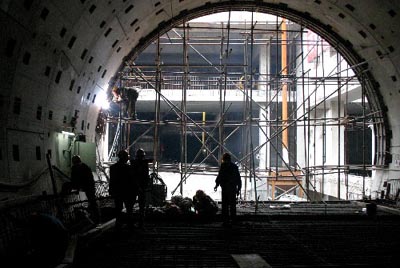 4月20日,工程技術人員在隧道口施工。當天,被譽為“萬里長江第一隧”的武漢長江隧道工程,繼19日成功實現(xiàn)雙線貫通之后全面進入道路路面鋪設。記者從工程建設指揮部獲悉,這一總投資達17億元的公路隧道可望年內建成通車。