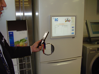 飲料被買(mǎi)回家中,將它們放入冰箱,這時(shí),冰箱上的標(biāo)簽閱讀器同樣會(huì)自動(dòng)記錄下這些商品,構(gòu)成一個(gè)小型的庫(kù)存管理系統(tǒng);當(dāng)從冰箱中取出這罐飲料時(shí),它會(huì)認(rèn)為被喝完了,此時(shí)冰箱庫(kù)存會(huì)發(fā)生變化。這樣的庫(kù)存管理一直持續(xù)到下次購(gòu)物時(shí),冰箱會(huì)提供一份它的"缺貨清單"。圖7即為家用RFID冰箱。