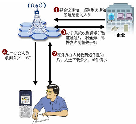 如上圖所示,企業(yè)可利用中國移動北京公司提供的短信平臺,向移動電話用戶提供各類應(yīng)用服務(wù)。輔助企業(yè)內(nèi)部辦公,提高工作效率。