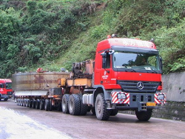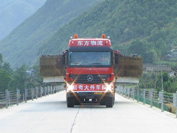 此次超寬大件運(yùn)輸任務(wù)共使用車輛7臺(tái),主車先后采用了先進(jìn)的沃爾沃FH12和奔馳Actros 3354等車型,27名隨車人員及時(shí)妥善處理沿途障礙、更換裝備等工作。由于所經(jīng)線路的路面、收費(fèi)站、樹木等障礙物較多,且該批部件屬108國道上運(yùn)輸?shù)淖顚挷考?dāng)?shù)亟痪氛块T高度重視,先后派出250人次進(jìn)行全程押運(yùn)護(hù)送;東方物流對(duì)不同的路段采用不同的裝車方式進(jìn)行運(yùn)輸:對(duì)轉(zhuǎn)彎半徑小的路段采取換裝方式,對(duì)收費(fèi)站和突巖采取避讓、繞道、搬移、挖掘等方式使其順利通過。