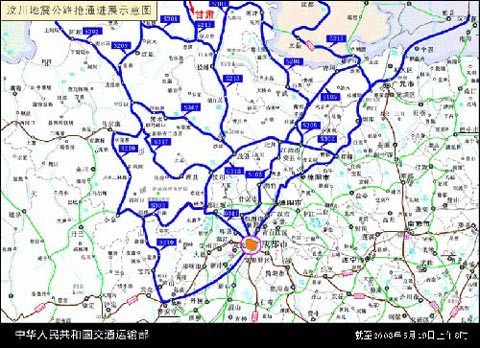 戴東昌介紹,到目前為止,通往重災(zāi)區(qū)的三條生命線,作為公路運(yùn)輸?shù)闹魍ǖ酪呀?jīng)打通。第一條搶通的是通往汶川的大通道,它是在5月15號晚上9點(diǎn)半打通。之后,相繼在5月17號打通了從甘肅往南到茂縣的北線,以及從成都經(jīng)過都江堰到映秀的南線。應(yīng)該說南線這條線最艱難,災(zāi)情最嚴(yán)重,在搶通過程中遇到困難也是最大的。這三條生命線在維護(hù)人員的全力維護(hù)下能夠保持暢通。