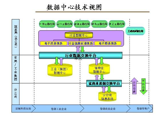 統(tǒng)一標準就是統(tǒng)一煙草行業(yè)信息標準體系,它是行業(yè)信息化建設的前提。統(tǒng)一平臺就是統(tǒng)一煙草行業(yè)信息技術(shù)平臺,它是行業(yè)信息化建設的基礎。統(tǒng)一數(shù)據(jù)庫就是統(tǒng)一煙草行業(yè)數(shù)據(jù)中心建設,它是行業(yè)信息化建設的核心。統(tǒng)一網(wǎng)絡就是以行業(yè)地面骨干網(wǎng)為核心,覆蓋全行業(yè)互聯(lián)互通的地面網(wǎng)絡。統(tǒng)一網(wǎng)絡是行業(yè)信息化建設的保障。