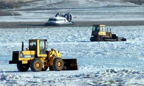 圖:黑龍江同江口岸冬季冰封河面,鏟車在冰面整理,以便開展中俄兩國之間的冰上運輸