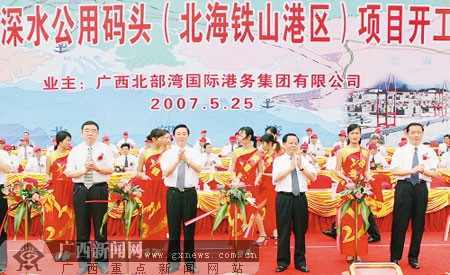 5月25日上午,廣西北部灣港口深水公用碼頭項目開工儀式在北海、欽州、防城港三市同時舉行。自治區黨委書記劉奇葆、自治區主席陸兵、自治區政協主席馬慶生等為北海鐵山港區項目開工剪彩。廣西新聞網-廣西日報記者劉宇攝
