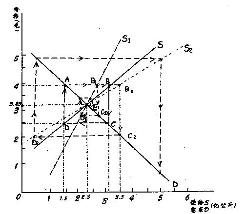 二是供給曲線Sl的彈性小于需求曲線D,運行線路變?yōu)槭諗啃,不斷逼近均衡點E。三是供給曲線S,的彈性大于需求曲線D,運行線路變?yōu)榘l(fā)散型,離均衡點E越來越遠,價格波動越來越大。供給量必然大起大落,糧食供給量大起大落必然殃及社會經(jīng)的濟穩(wěn)定。
