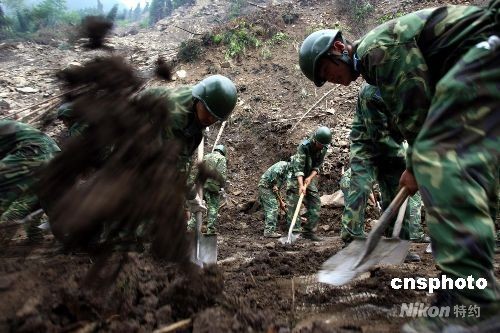 6月8日,中國空降兵某部進村入戶之后,在四川省什邡市鎣華鎮(zhèn)清理通往麻柳坪盤山公路上的滑坡,幫助當?shù)厥T村恢復交通。圖為官兵在麻柳坪盤山公路上清理滑坡碎石。 中新社發(fā) 譚超 攝