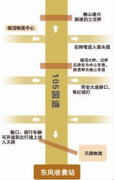 105國道從東鳳加油站往北通向順德和廣州,是中山市的北大門。一出東鳳加油站,東邊是大型的天潤物流市場,在南頭路口的西邊,緊挨著的又是一個大型的細(xì)滘物流中心,兩大市場之間,更是櫛比鱗次地排列著數(shù)不清的物流公司和貨運代辦點。站在這條路上,看著繁忙的景象,就在你贊嘆道路重要性的同時,你也不免擔(dān)憂,這么多車集中在這里,怎么能暢通呢?