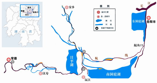 常鲇航線主線西起常德、東至鲇魚口,為192公里千噸級航道,穿過洞庭湖腹地,溝通西洞庭、東洞庭和南洞庭,連接四水并與湘江千噸級航道匯合,然后經(jīng)城陵磯進(jìn)入長江,通江達(dá)海。支線為安鄉(xiāng)至茅草街,共53公里500噸級航道。