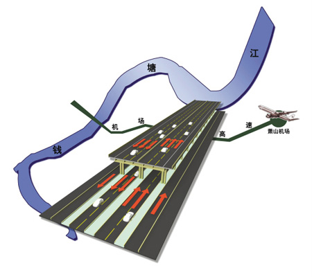 杭州蕭山國際機(jī)場快速路起于原錢江三橋南岸收費(fèi)站,終點(diǎn)為蕭山國際機(jī)場大門,總長18.664公里,道路設(shè)計(jì)速度為100公里/每小時。