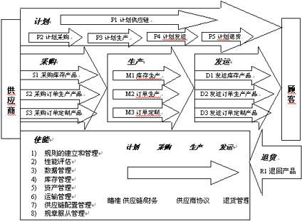 SCOR (Supply-Chain Operations Reference-model) 是由供應(yīng)鏈協(xié)會 (Supply-Chain Council) 開發(fā)支持,適合于不同工業(yè)領(lǐng)域的供應(yīng)鏈運作參考模型。1996年春,兩個位于美國波斯頓的咨詢公司 - Pittiglio Rabin Todd & McGrath (PRTM) 和 AMR Research (AMR) - 為了幫助企業(yè)更好地實施有效的供應(yīng)鏈,實現(xiàn)從基于職能管理到基于流程管理的轉(zhuǎn)變,牽頭成立了供應(yīng)鏈協(xié)會 (SCC) ,并于當(dāng)年底發(fā)布了供應(yīng)鏈運作參考模型 (SCOR)。SCOR是第一個標(biāo)準(zhǔn)的供應(yīng)鏈流程參考模型,是供應(yīng)鏈的診斷工具,涵蓋所有行業(yè)(參見圖一和圖二)。SCOR使企業(yè)間能夠準(zhǔn)確地交流供應(yīng)鏈問題,客觀地評測其性能,確定性能改進的目標(biāo),并影響今后供應(yīng)鏈管理軟件的開發(fā)。流程參考模型通常包括一整套流程定義,測量指標(biāo)和比較基準(zhǔn)以幫助企業(yè)開發(fā)流程改進的策略。SCOR不是第一個流程參考模型,但卻是第一個標(biāo)準(zhǔn)的供應(yīng)鏈參考模型。SCOR模型主要由四個部分組成:供應(yīng)鏈管理流程的一般定義,對應(yīng)于這些流程的性能指標(biāo)基準(zhǔn),供應(yīng)鏈 "最佳實施" (best practices) 的描述以及選擇供應(yīng)鏈軟件產(chǎn)品的信息。