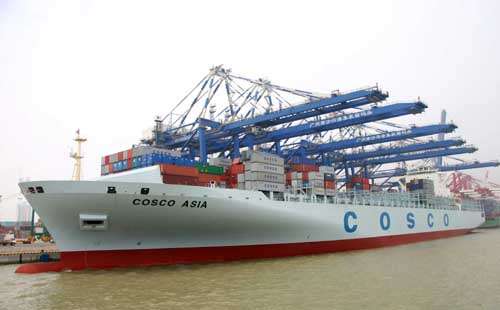 圖:廣州南沙港區成為廣州港手上一張王牌。圖為中遠一艘巨型貨柜船泊在碼頭前沿裝卸貨柜