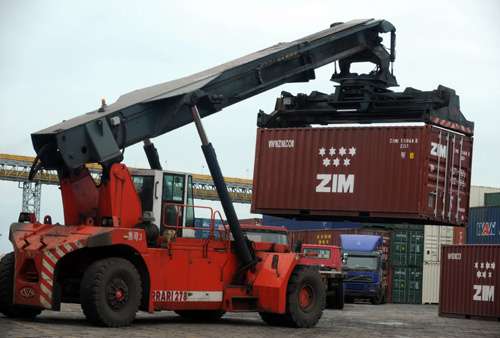 圖:廣西防城港碼頭正面吊機裝運集裝箱貨物