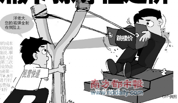 “國(guó)內(nèi)件價(jià)格從原來(lái)的30多元每件壓低到十多元,加之其本來(lái)具有的技術(shù)和人才方面的優(yōu)勢(shì),國(guó)內(nèi)快遞公司遭受巨大打擊!标惲⒈^預(yù)測(cè),受經(jīng)濟(jì)下滑和價(jià)格戰(zhàn)的雙重影響,未來(lái)將有大批國(guó)內(nèi)民營(yíng)快遞公司倒閉。