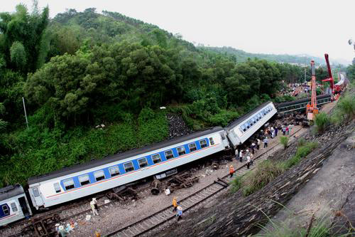 2008年6月30日2時(shí)20分,由廣州開往重慶的1322次旅客列車行至黎湛鐵路廣西境內(nèi)米場(chǎng)—玉林間164公里900米處,因山體滑坡,造成機(jī)車及機(jī)后1至6位車廂脫軌,7人受輕傷,黎湛鐵路中斷行車。 搶修人員正在現(xiàn)場(chǎng)工作。圖片來源:唐輝吉/CFP