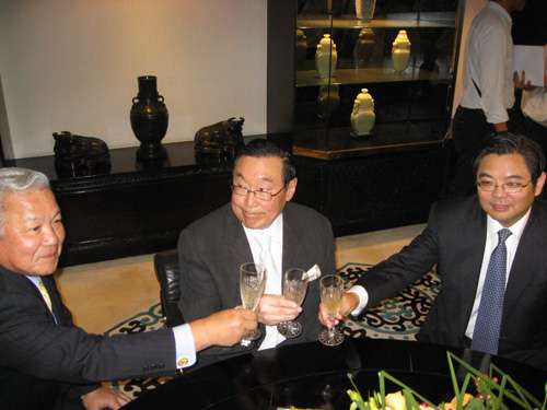 圖:華光海運主席趙世光(中)與租家日本三光汽船社長松井毅(左)與造船方的大連重工董事長兼總經理孫波(右)三方在簽約后飲香檳(本報攝)