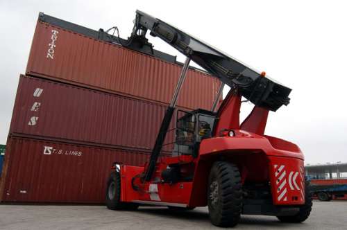 圖:中國青島港貨柜堆場一正面吊在起重一個貨柜