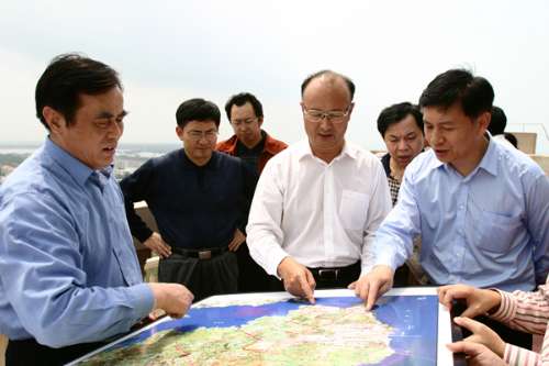圖:洋浦開發(fā)區(qū)管理局局長(zhǎng)丁尚清(中)在向海南省副省長(zhǎng)姜斯憲(右)介紹開發(fā)區(qū)情況