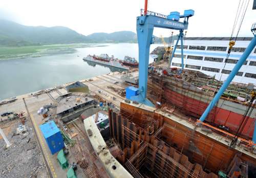 圖:江西九江將成為長江中段最大船舶建造基地。在江西江州聯合造船有限責任公司的船臺上,兩艘外銷船在建造中