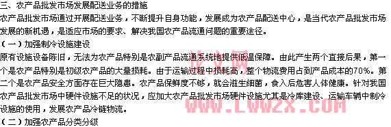 為完成農(nóng)產(chǎn)品批發(fā)職能,批發(fā)市場(chǎng)必然擁有大面積的土地,建設(shè)大量的倉(cāng)庫(kù),并且配備相當(dāng)數(shù)量的汽車及其它倉(cāng)儲(chǔ)、運(yùn)輸、裝卸、搬運(yùn)等機(jī)械設(shè)備。同時(shí)為了方便結(jié)算,市場(chǎng)中建有旅館、銀行等服務(wù)設(shè)施。市場(chǎng)能夠根據(jù)客戶需要,提供代提貨、代存儲(chǔ)、代運(yùn)輸、代辦貨款結(jié)算及分選、裝箱、加工等服務(wù)。這些為農(nóng)產(chǎn)品批發(fā)市場(chǎng)開(kāi)展配送業(yè)務(wù)提供了所需的設(shè)施設(shè)備等服務(wù)條件。