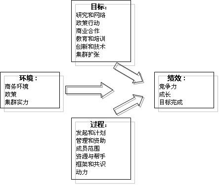 1、實(shí)施集群創(chuàng)導(dǎo)(Cluster Initiative)戰(zhàn)略。國(guó)家或地方為了促進(jìn)集群的發(fā)展,通常在一個(gè)或幾個(gè)集群形成之后,對(duì)集群采取一系列推動(dòng)、治理和創(chuàng)新政策,即實(shí)施集群創(chuàng)導(dǎo)。集群創(chuàng)導(dǎo)涉及集群企業(yè)、政府和(或)研究機(jī)構(gòu),是有組織的活動(dòng),其目的在于推動(dòng)一地區(qū)內(nèi)集群的成長(zhǎng)和提高其競(jìng)爭(zhēng)力。集群創(chuàng)導(dǎo)實(shí)施模型為理解、分析、評(píng)價(jià)集群創(chuàng)導(dǎo)提供了概念框架。該模型基于四個(gè)要素:三種驅(qū)動(dòng)力(地區(qū)或國(guó)家的社會(huì)、政治、經(jīng)濟(jì)環(huán)境,集群創(chuàng)導(dǎo)的目標(biāo),集群創(chuàng)導(dǎo)的過(guò)程)和集群創(chuàng)導(dǎo)的績(jī)效,如圖1所示。