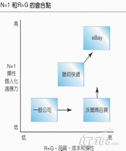 所有的例子──沃爾瑪百貨、聯(lián)邦快遞、優(yōu)比速和eBay,都是運用企業(yè)流程為核心競爭元素。這里提的公司,沒有一家是使用標準軟件包的企業(yè)流程來經(jīng)營事業(yè)。這些公司的企業(yè)流程反映出他們獨特的商業(yè)模式,一切都是從內(nèi)部建立的。在這些公司里,企業(yè)流程明顯地被當成是競爭優(yōu)勢來源,而受到保護、獲得培養(yǎng)。這四種商業(yè)模式反映出邁向N=1和R=G不同的演化階段,如下圖所示。