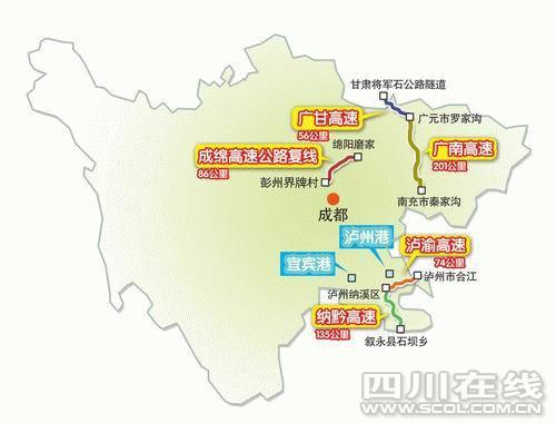 廣南高速:廣元至南充高速公路是國(guó)家高速公路網(wǎng)規(guī)劃蘭州至海口高速公路的組成部分。起于廣元市羅家溝,經(jīng)衛(wèi)子、永寧、蒼溪、南充市閬中、南部、西充,止于南充市秦家溝,路線全長(zhǎng)201公里,總投資約150.3億元,建設(shè)工期4年。