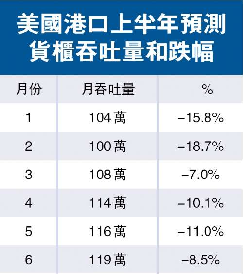 據全美零售聯盟(NRF)及IHST下屬的「全球視野」網站所做的美國港口貨物吞吐量追蹤報告顯示,預測美國今年上半年港口貨柜吞吐量仍然會下跌,跌幅估計在11.8%。